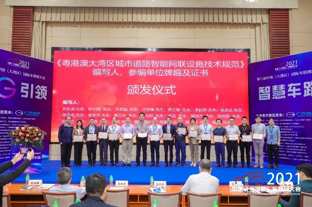 在標準發(fā)布會上,公司代表編寫組解讀發(fā)表了《粵港澳大灣區(qū)城市道路智能網(wǎng)聯(lián)設(shè)施技術(shù)規(guī)范》標準要點主題演講。中國(大灣區(qū))國際車聯(lián)網(wǎng)大會組委會、廣東省車聯(lián)網(wǎng)產(chǎn)業(yè)聯(lián)盟向主參編單位頒發(fā)了牌匾和榮譽證書、成立了粵港澳大灣區(qū)車聯(lián)網(wǎng)標準工作委員會。鐘小明、李瑞美獲得標準編寫人榮譽證書,獲得2021年度車聯(lián)網(wǎng)杰出人物獎。
